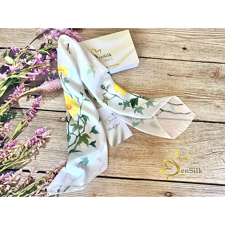Khăn Lụa Vuông Vẽ Hoa Dã Quỳ SenSilk 90x90cm, Painting Silk Scarves for Women, Khăn Quàng Cổ Thời Trang