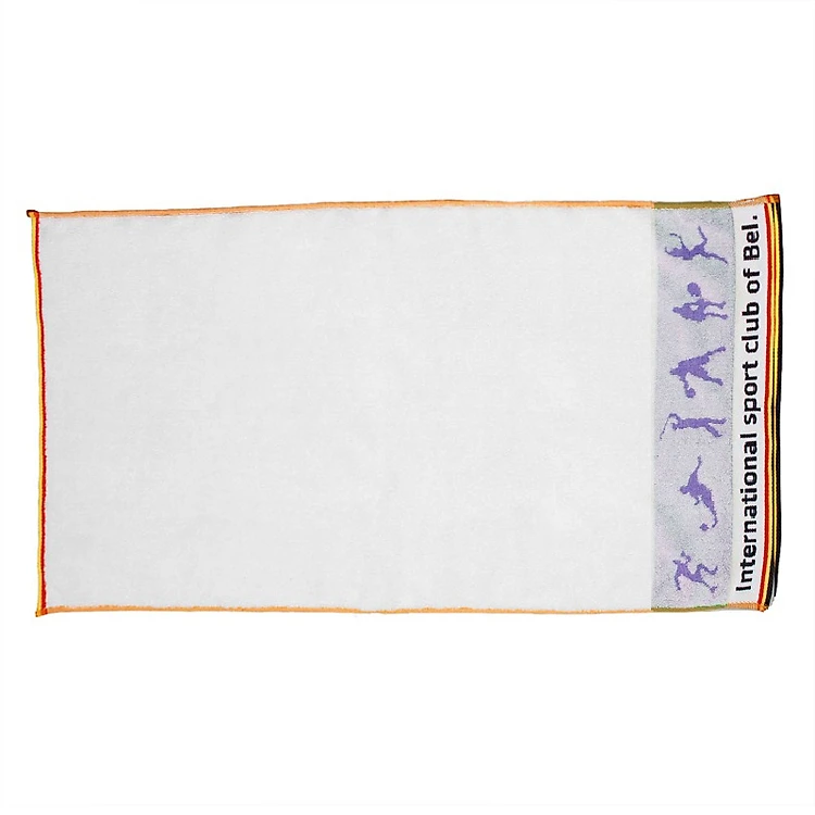 Khăn có kiểu dáng thể thao với nền trắng, được tô điểm thêm bằng đường viền hình các vận động viên môn điền kinh, bóng đá, gôn, bóng rổ, tennis và trượt băng nghệ thuật màu tím, rất phù hợp cho những ai yêu thích vận động.