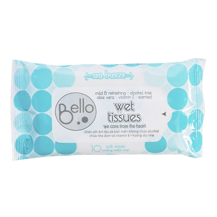 - Khăn Ướt Bello Hương Biển Xanh BE3964 (10 Tờ) là sản phẩm làm sạch và dưỡng ẩm cho da với công thức dịu nhẹ không chứa các chất bảo quản gây hại như paraben, MIT, CIT và cồn, chứa các dưỡng chất giúp làm sạch mà không gây kích ứng da.
