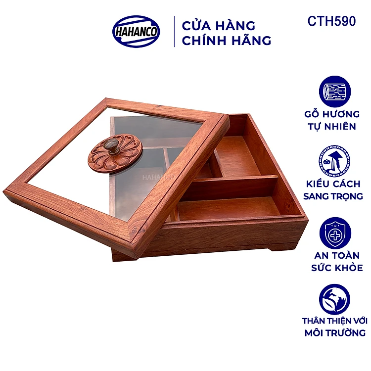 Khay Bánh Kẹo Mứt Tết Gỗ Hương Nắp Kính Vuông Trong Suốt Thiết Kế Trang Trọng - CTH590