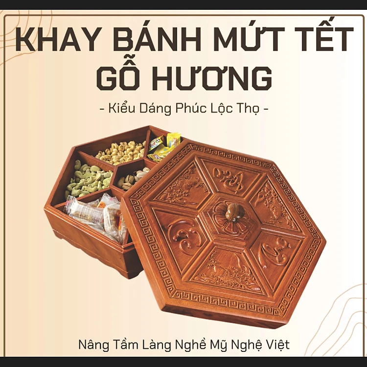 Khay đựng bánh kẹo Tết bằng gỗ, hộp đựng bánh kẹo Tết chất liệu gỗ hương cao cấp để bàn phòng khách