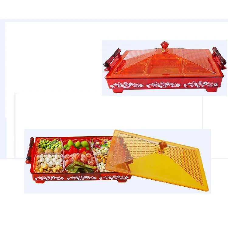 - Hộp mứt được thiết kế hình chữ nhật độc đáo từng ngăn riêng biệt cùng với thể tích lớn giúp để phân chia các loại bánh kẹo và mứt khác nhau.