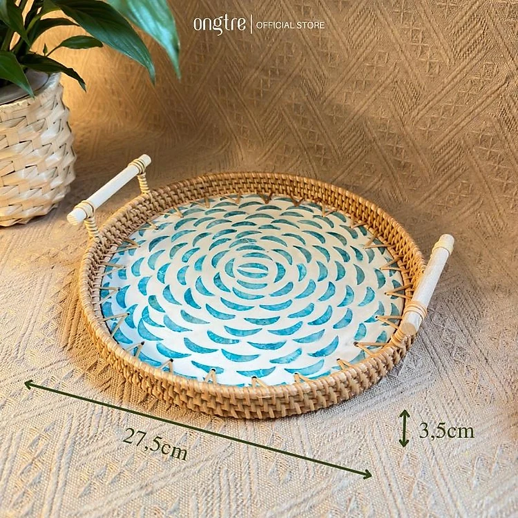 Khay mây tròn khảm trai có tay cầm ONGTRE đựng đồ, trang trí tiệc, decor chụp ảnh sản phẩm - OTT2