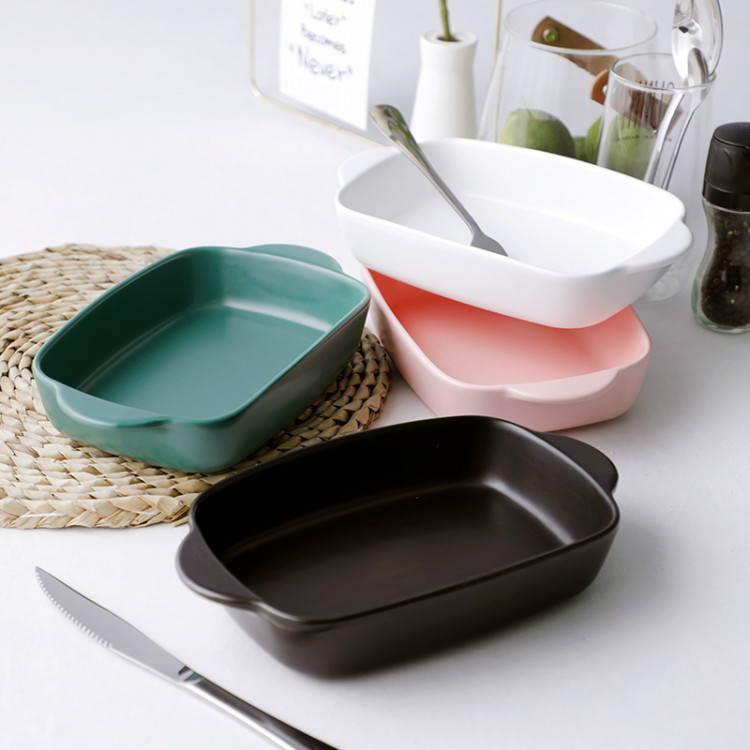 Khay nướng bánh bằng sứ hình chữ nhật có tay cầm dùng làm các loại bánh như: bánh bông lan, bánh dẻo, bánh bò, hoặc sáng tạo làm các loại bánh khác với hình dáng chữ nhật sang trọng, đẹp mắt.