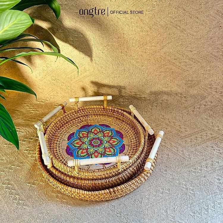Khay Phục Vụ Tay Cầm ONGTRE Bằng Mây Đáy Gỗ Họa Tiết Đựng Bánh Mì Trái cây Phong Cách Vintage