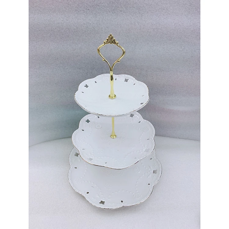 KHAY SỨ ĐỰNG BÁNH KẸO HOA QUẢ 3 TẦNG TRẮNG HOA DẬP NỔI - ANTH618