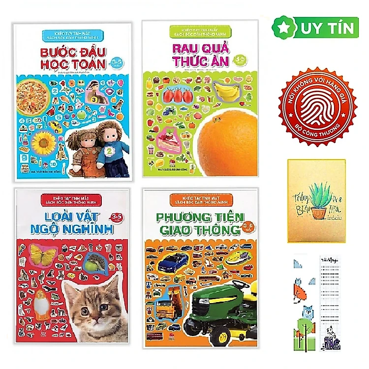 Khéo Tay Tinh Mắt, Sách Bóc Dán Thông Minh - Bước Đầu Học Toán + Rau Quả Thức Ăn + Loài Vật Ngộ Nghĩnh + Phương Tiện Giao Thông - Combo 4 Cuốn (Tặng kèm Bookmark CÚ MÈO + SỔ TAY XƯƠNG RỒNG)