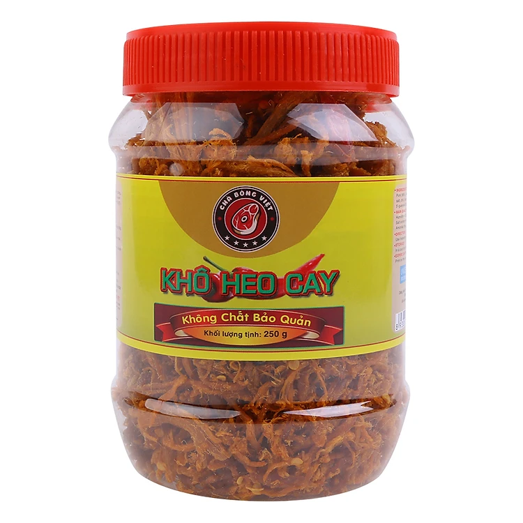 - Khô Heo Cay - Chà Bông Việt (250g) được làm từ thịt heo tươi nguyên chất và tẩm ướp gia vị đậm đà. Từng miếng khô heo thơm nồng, hương vị cay kích thích khi ăn kèm cùng với tương ớt sẽ khiến bạn muốn thưởng thức mãi không thôi.