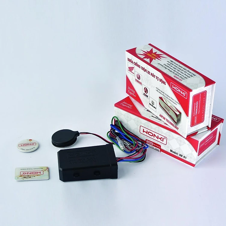 - Khi gắn khóa chống trộm HK01 vào xe máy, khách hàng vẫn sử dụng ổ khóa cơ học. Khách hàng đeo một thẻ từ vào móc chìa khóa hiện tại. Khi xe bị mở ổ khóa thiết bị Honki HK01 sẽ kiểm tra quanh vùng anten cảm ứng của nó có xuất hiện thẻ từ hợp lệ hay không?. Nếu đúng thẻ từ sẽ cho nổ máy, nếu không đúng sẽ ngắt hệ thống khởi động ngay lập tức và sau 10 giây sẽ phát báo động bằng còi. Mỗi một thẻ từ có một mã số riêng nên không bị trùng lặp.
