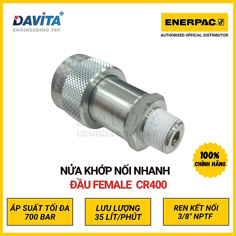 CR400 Nửa khớp nối nhanh Enerpac đường dầu thủy lực áp tối đa 700bar, 1 đầu Cái (Female half) để nối với CH604, 1 đầu ren trong 3/8" NPTF Female