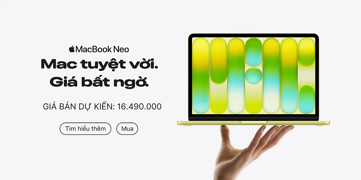 Giới thiệu MacBook Neo – chiếc Mac tuyệt vời với mức giá bất ngờ. Từ thiết kế nhôm bền bỉ đến màn hình Liquid Retina hiển thị chi tiết sống động. Với sức mạnh AI tiên tiến, Apple Intelligence được tích hợp sẵn và luôn sẵn sàng hỗ trợ bạn. Cùng thời lượng pin cả ngày để đồng hành từ sáng đến đêm. Đây là một cách tuyệt diệu mới để yêu Mac mỗi ngày. Chào mừng bạn đến với gia đình.