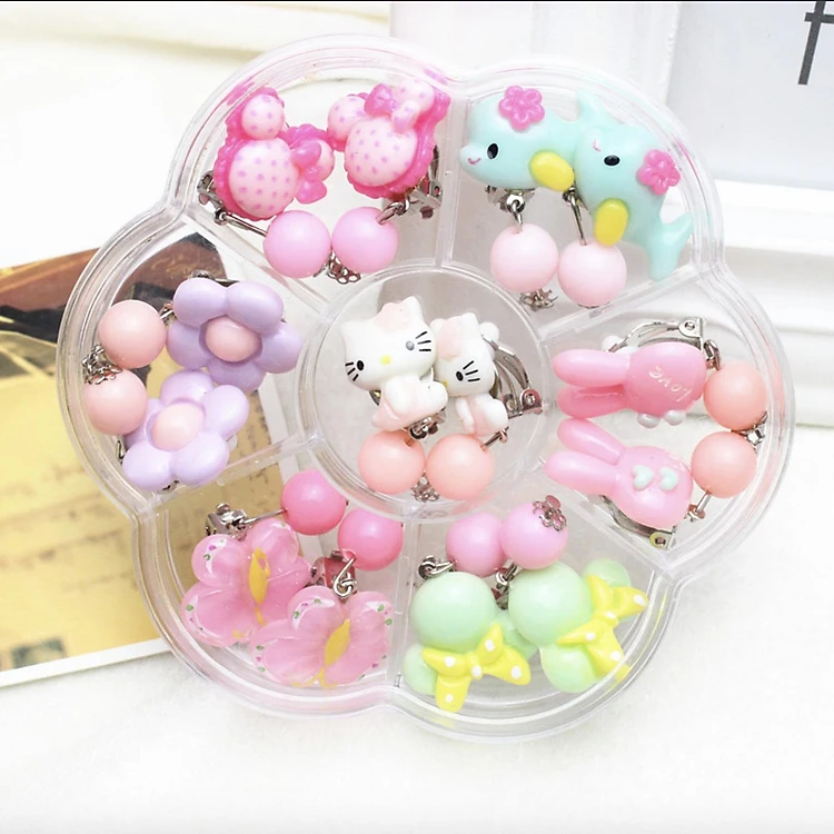 Khuyên tai kẹp cho bé nhựa họa tiết hoạt hình nhiều màu hình hoa - Combo hộp 7 đôi