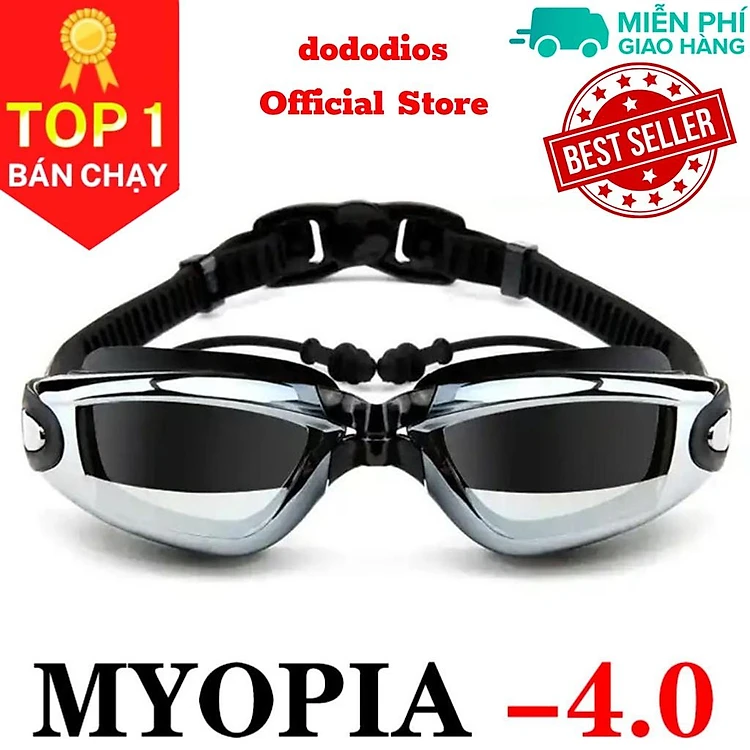 Kính bơi cận thị độ cận 4.0 độ có gắn nút bịt tai ngăn nước; mắt kiếng bơi chống tia UV, chống hấp hơi