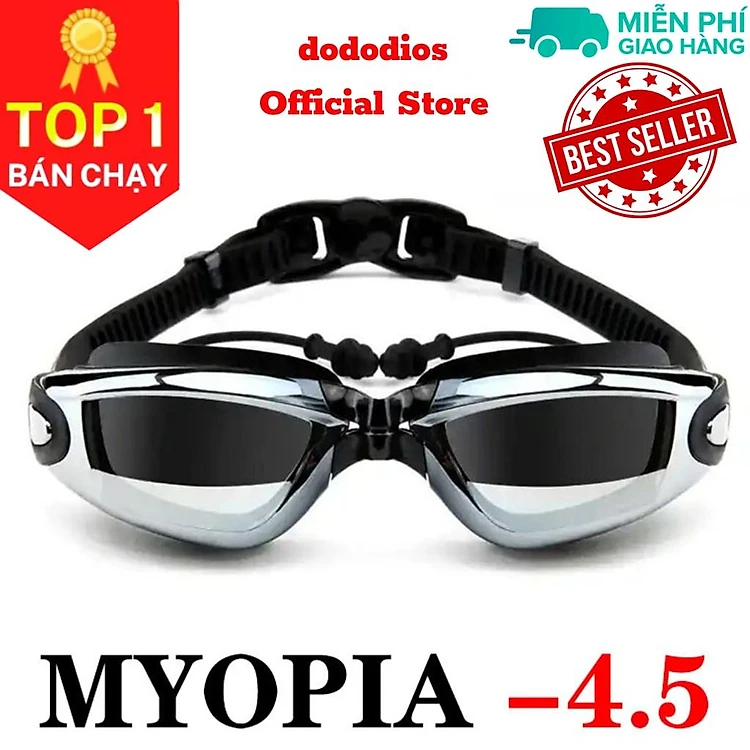 Kính bơi cận thị độ cận 4.5 độ có gắn nút bịt tai ngăn nước; mắt kiếng bơi chống tia UV, chống hấp hơi