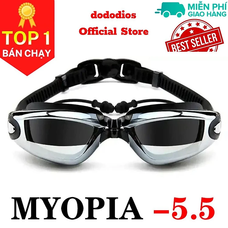 Kính bơi cận thị độ cận 5.5 độ có gắn nút bịt tai ngăn nước; mắt kiếng bơi chống tia UV, chống hấp hơi