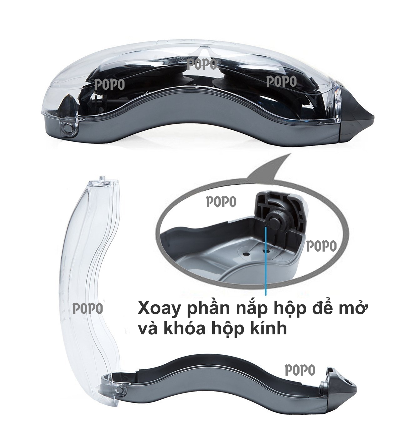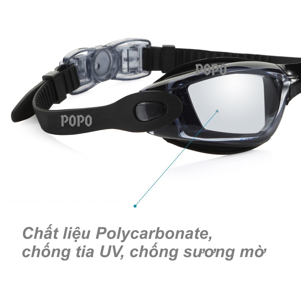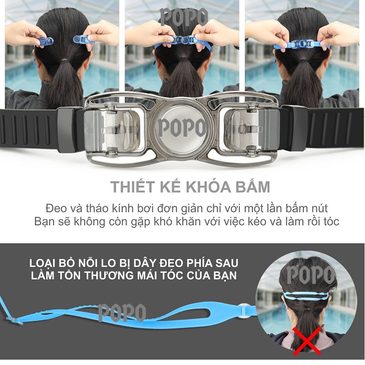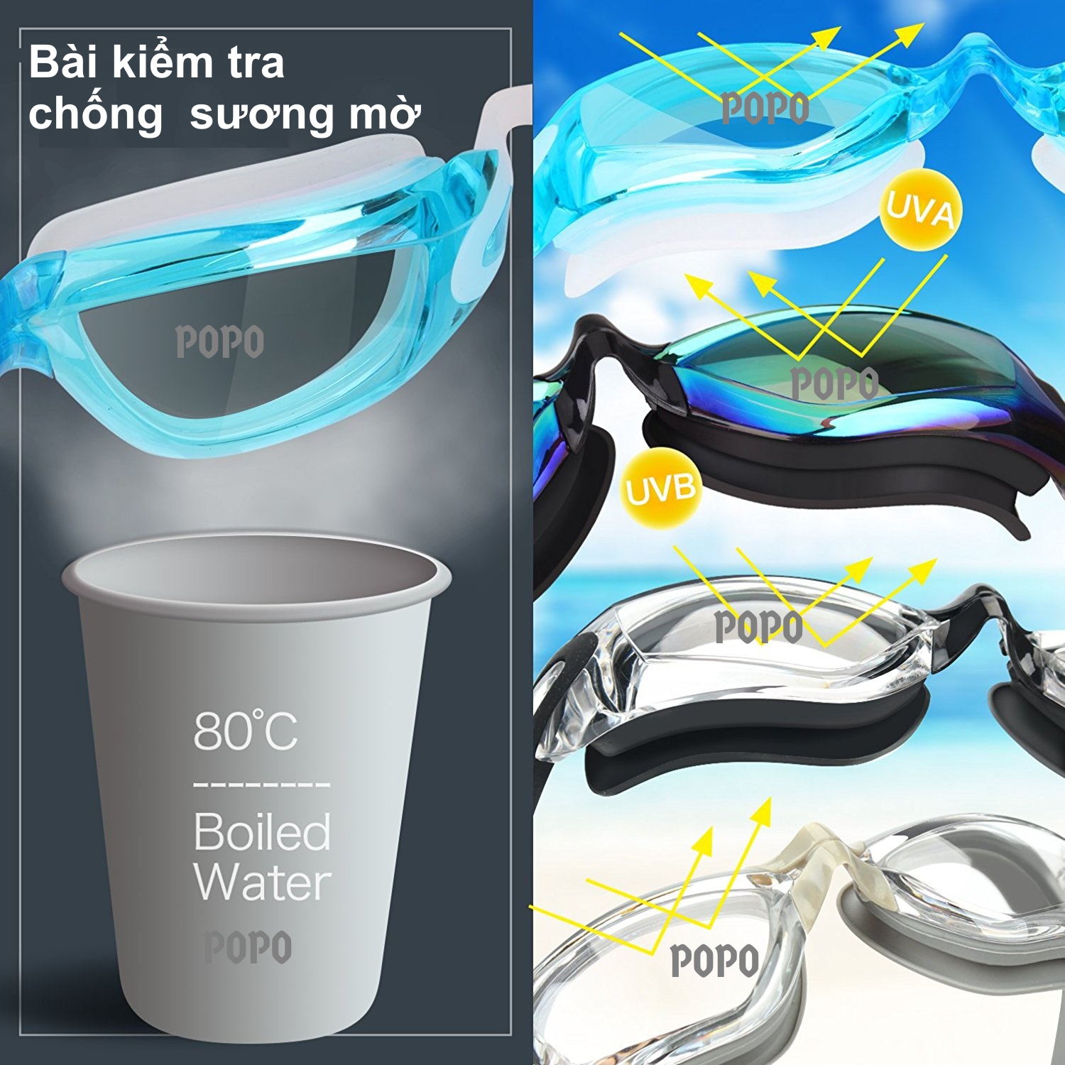 Kính bơi thời trang 2360 của POPO Collection chống tia UV, chống sương mờ qua bài kiểm tra chống sương mờ.