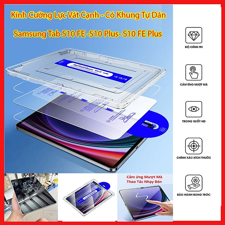 Kính Cường lực Cho Samsung Tab S10 lite, S10 FE, S10 Plus - Vát Cạnh, Có Khung Tự Dán Chuẩn, full màn hình, Chống Va Đập
