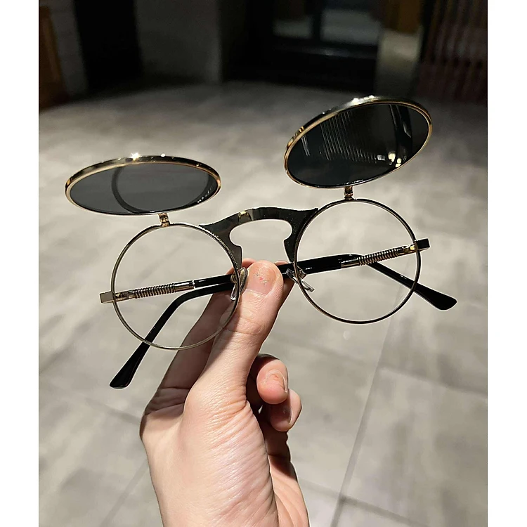 Kính râm Mắt tròn xoe 2 lớp mở nắp gọng kim loại
