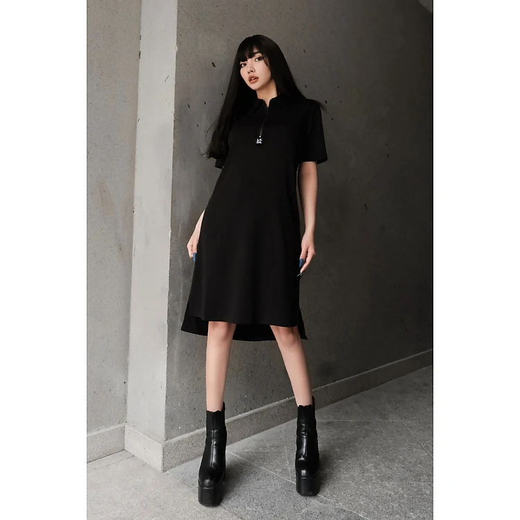LAAS Đầm suông cổ polo DK đen form rộng thoải mái năng động