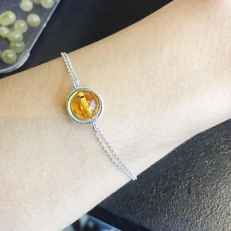 Lắc tay bạc (dây đôi) phong thủy Hổ phách thiên nhiên LT007