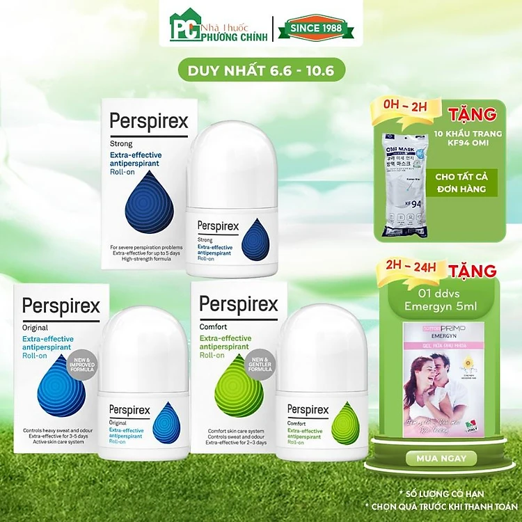• Perspirex Strong (xanh đậm): dành cho trường hợp nặng nhưng da khỏe (da nhạy cảm không nên dùng).