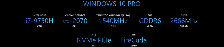 Bộ vi xử lý Intel Core i7-9750H mới nhất kết hợp với RAM DDR4-2666 lên đến 32GB cho phép chạy mọi tựa game và ứng dụng “ngốn tài nguyên” một cách nhẹ nhàng. Dung lượng lưu trữ cực đã, gồm một SSD M.2 NVMe PCIe 3.0 lên tới 1TB và một SSHD FireCuda 1TB, cho phép bạn thoải mái mang theo bên mình cả thư viện game và kho lưu trữ công việc đến bất cứ đâu tùy thích.