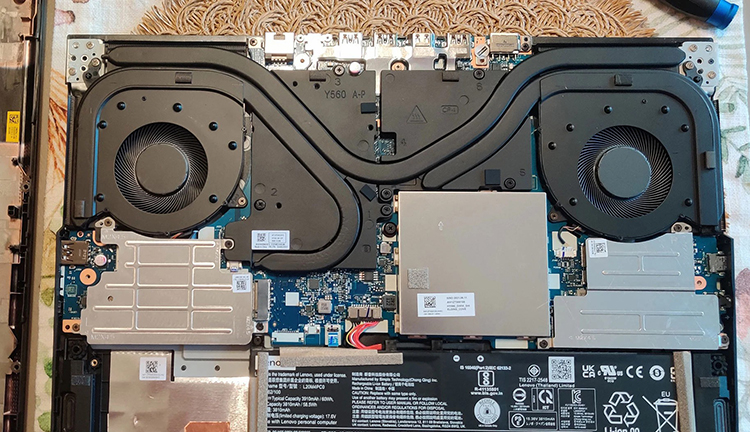 Khi vào bên trong, bạn có thể nhìn rõ bên trong. Các mô-đun SSD và Wifi nằm dưới tấm chắn nhiệt bên phải. Ngoài ra còn có một tấm chắn nhiệt khác ở bên trái có khe M.2 thứ hai bên dưới. Cả hai tấm chắn này đều được cố định bằng nhiều vít hơn.