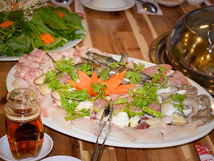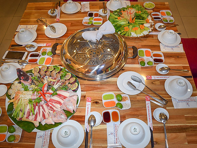 Lẩu hơi tại Nhà hàng Rạng Đông với các món ăn kèm được sơ chế sạch sẽ