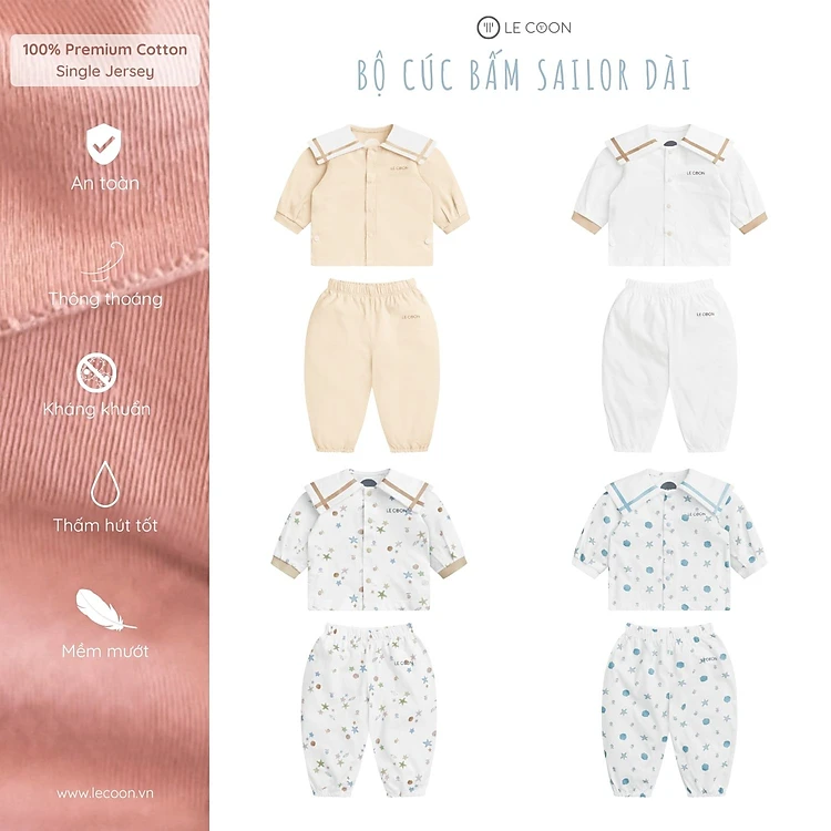 LE COON | BỘ CÚC BẤM SAILOR DÀI | Vải COOL mỏng mát | 0-18 tháng