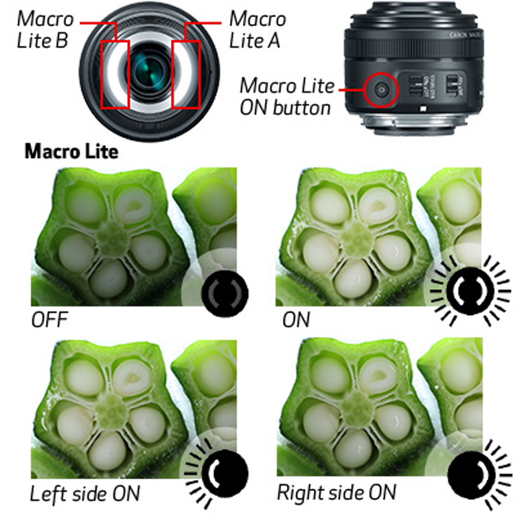 Đặc biệt, Canon EF-S 35mm f/2.8 Macro IS STM còn trang bị vòng đèn Macro Lite được tích hợp 2 đèn bên trong, bạn hoàn toàn có thể bật một trong hai đèn hoặc bật cả hai đèn cùng một lúc với nút bấm điều chỉnh ngay trên thân ống kính. Đáng chú ý hơn, chiếc đèn led này có 2 chế độ là rất sáng và sáng vừa, bạn cũng chỉ cần bấm nút bật điều thay đổi chế độ này.