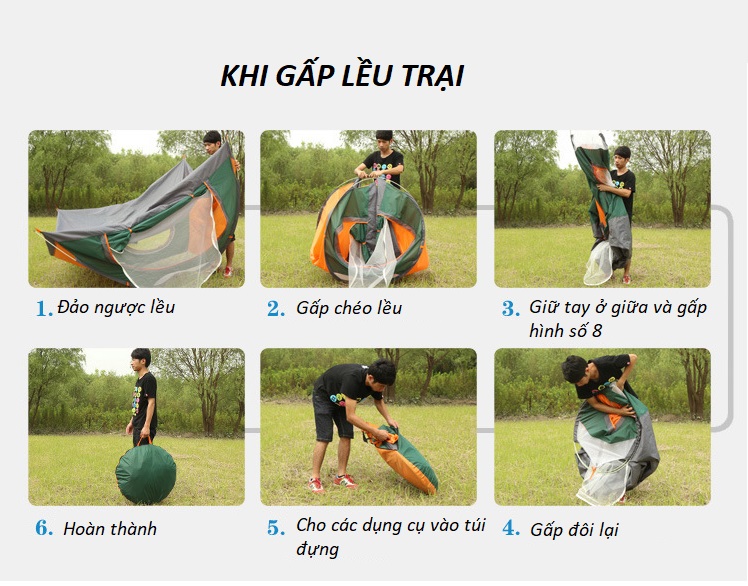 B4: Từ hình số 8 gập đôi lại thành hình tròn, cho vào bao lều cắm trại là xong.