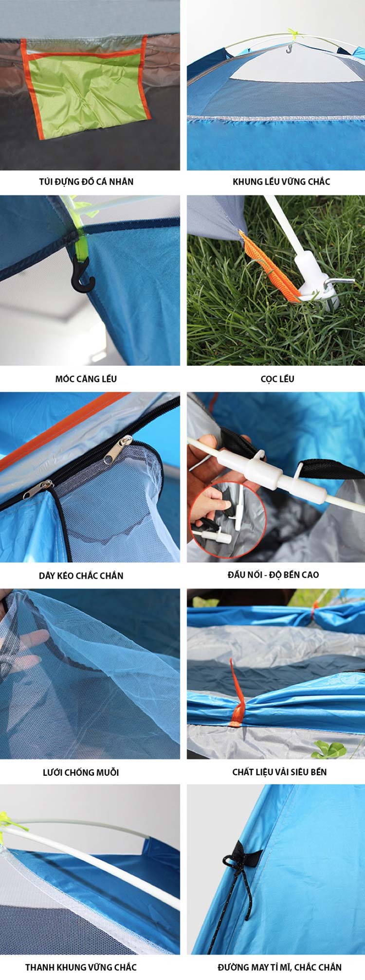 - Lều được thiết kế 2 cửa với dây khóa kéo chắc chắn, dễ sử dụng. Đặc biệt, lều được làm bằng chất liệu vải 170T - 210D cao cấp với cấu trúc lều: 1 lớp + 1 lớp lưới ngăn muỗi.