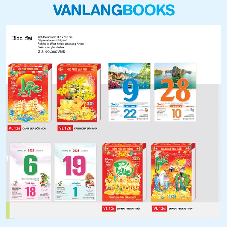 Lịch 2026 Bloc Đại – Cảnh Đẹp Bốn Mùa | Lịch Tết Treo Tường Văn Lang | Mã: VL12A