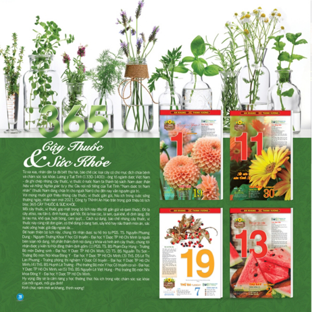 Để hoàn thiện bộ lịch này, chúng tôi nhận được sự hỗ trợ từ PGS.TS. Nguyễn Phương Dung – Nguyên Trưởng Khoa Y học Cổ truyền – Đại học Y Dược TP Hồ Chí Minh là người biên soạn nội dung. Về phần thẩm định nội dung y khoa và hình ảnh cây thuốc, chúng tôi nhận được ý kiến từ Hội đồng thẩm định gồm: (1) PGS.TS. BS Phạm Duy Hùng -Trưởng Bộ môn Dưỡng sinh – Đại học Y Dược TP Hồ Chí Minh; (2) TS. BS Nguyễn Thị Sơn – Trưởng Bộ môn Nội khoa Đông Y – Đại học Y Dược TP Hồ Chí Minh; (3) ThS. DS Lê Thị Lan Phương – Trưởng phòng thí nghiệm Y Dược Cổ truyền – Đại học Y Dược TP Hồ Chí Minh; (4) ThS. BS Huỳnh Lê Trường – Phó trưởng Bộ môn Y học Cổ truyền cơ sở – Đại học Y Dược TP Hồ Chí Minh; và (5) ThS. BS Nguyễn Lê Việt Hùng – Phó trưởng Bộ môn Nhi khoa Đông Y – Đại học Y Dược TP Hồ Chí Minh. Bộ lịch bloc“365 CÂY THUỐC & SỨC KHỎE”hy vọng là cẩm nang y học thường thức hữu ích trong việc chăm sóc sức khỏe của mỗi người, mỗi gia đình!
