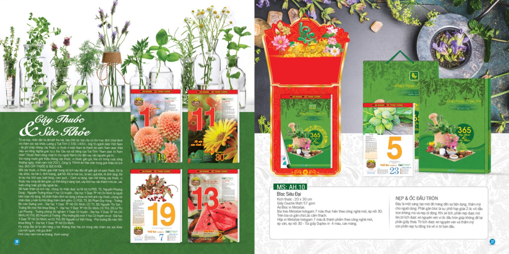 Từ xa xưa, nhân dân ta đã biết thu hái, bào chế các loại cây cỏ cho mục đích chữa bệnh và chăm sóc sức khỏe. Lương y Tuệ Tĩnh (1330-1400) – ông tổ ngành dược Việt Nam – đã ghi chép những cây thuốc, vị thuốc ở nước Nam ta thành bộ sách Nam dược thần hiệu và Hồng Nghĩa giác tư y thư. Câu nói nổi tiếng của Tuệ Tĩnh “Nam dược trị Nam nhân” (thuốc Nam dùng chữa trị cho người Nam) cho đến nay vẫn nguyên giá trị. Với mong muốn giới thiệu, phổ biến những cây thuốc, vị thuốc gần gũi, hữu ích, thiết thực cho cuộc sống thường ngày, nhân năm mới Tân Sửu 2021, Lịch tết Tân Phương Nam trân trọng phân phôi tới Quý vị bộ lịch bloc“365 CÂYTHUỐC & SỨC KHỎE”. Mỗi cây thuốc, vị thuốc góp mặt trong bộ lịch này đều rất gần gũi, quen thuộc. Đó là cây atiso, rau tần ô, đinh hương, quế hồi. Đó là hoa cúc, lá sen, quả khế, rễ đinh lăng. Đó là rau má, khổ qua, bưởi bòng, cam quýt… Và một điểm đặc biệt nữa, với những cây thuốc, vị thuốc này, cách bào chế vô cùng đơn giản. Cây thuốc có thể dùng ở dạng tươi, sấy khô hay nấu thành món ăn, sắc nước uống, đun xông hơi hoặc giã đắp ngoài da…