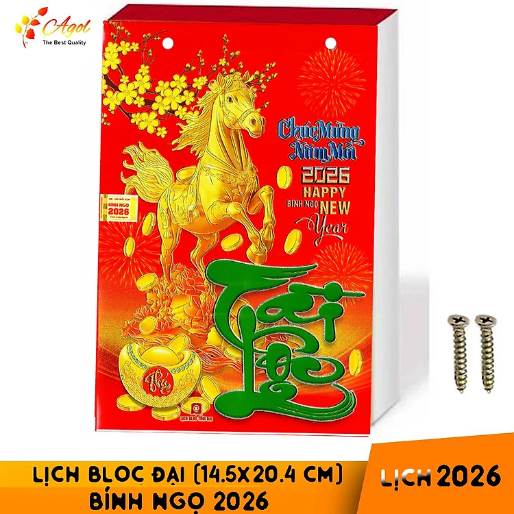 Lịch Bloc Tài Lộc 2026 Bính Ngọ có tem niêm yết (khổ giấy 14*20) kèm ốc vít giấy bóng ánh nhũ kim