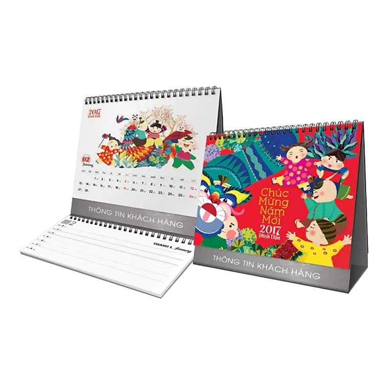 + Lịch thiết kế 1 tờ bìa cùng 12 tờ lịch bên trong, mỗi tờ thể hiện 1 tháng trong năm, đầy đủ dương lịch, âm lịch và các ngày lễ lớn.