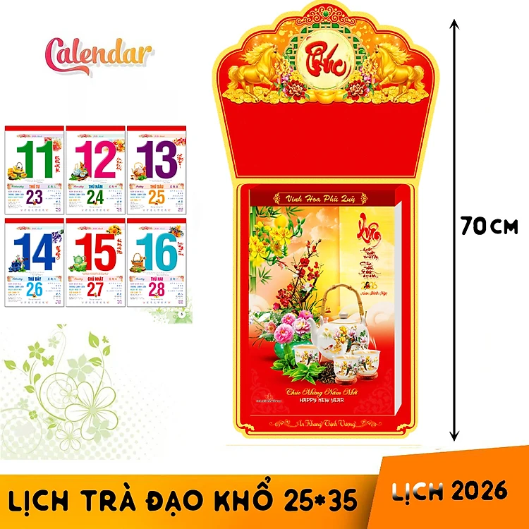 Lịch Trà Đạo khổ bloc 25 * 35 chiều dài tổng 70 cm mừng xuân 2026 Bính Ngọ có ngày giờ Hoàng Đạo chính xác