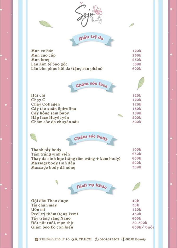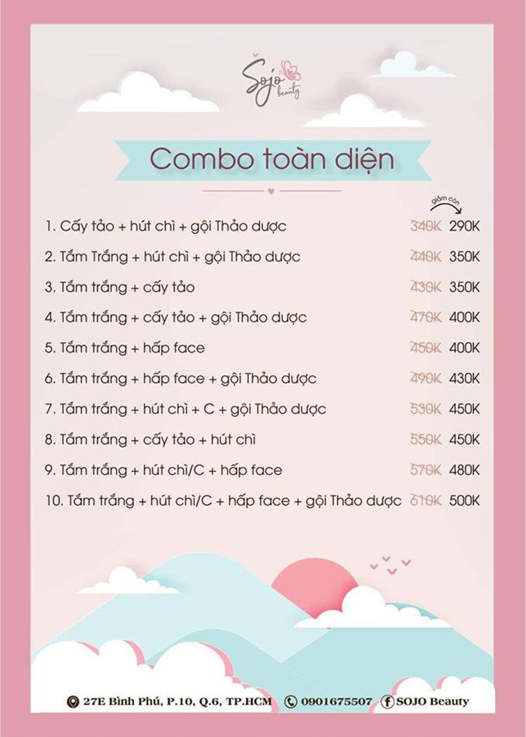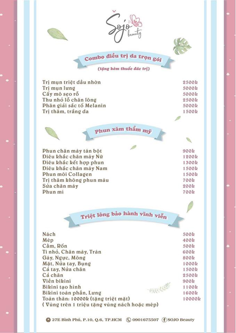 SOJO Beauty ra đời với mong muốn mang đến những dịch vụ chăm sóc sắc đẹp chất lượng và an toàn nhất, làm cho mọi người trở nên xinh đẹp và tự tin hơn trong cuộc sống. SOJO Beauty cung cấp đa dạng các dịch vụ như: Trị mụn, triệt lông, tắm trắng, phun xăm thẩm mỹ, lăn kim, tẩy trắng răng… Tất cả các liệu trình trị liệu tại SOJO Beauty đều ứng dụng công nghệ tiên tiến, máy móc thiết bị hiện đại, mỹ phẩm cao cấp với các thành phần chiết xuất từ thiên nhiên nhằm đem đến hiệu quả làm đẹp tối đa mà không để lại biến chứng hoặc gây nguy hiểm cho sức khỏe của khách hàng.