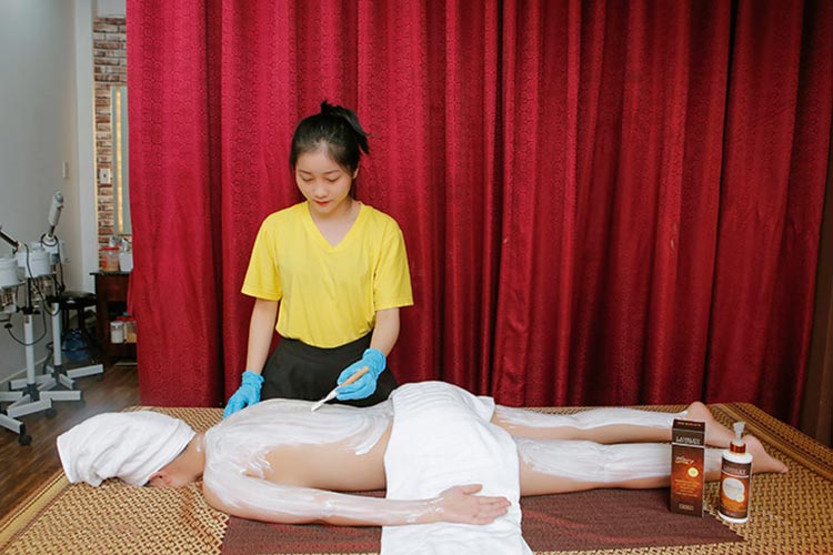 Bước 1: Tẩy tế bào khoáng sữa dê đậm đà cùng muối khoáng, thao tác massage thanh tẩy tận cùng lớp đáy vảy sừng tế bào chết.