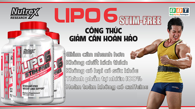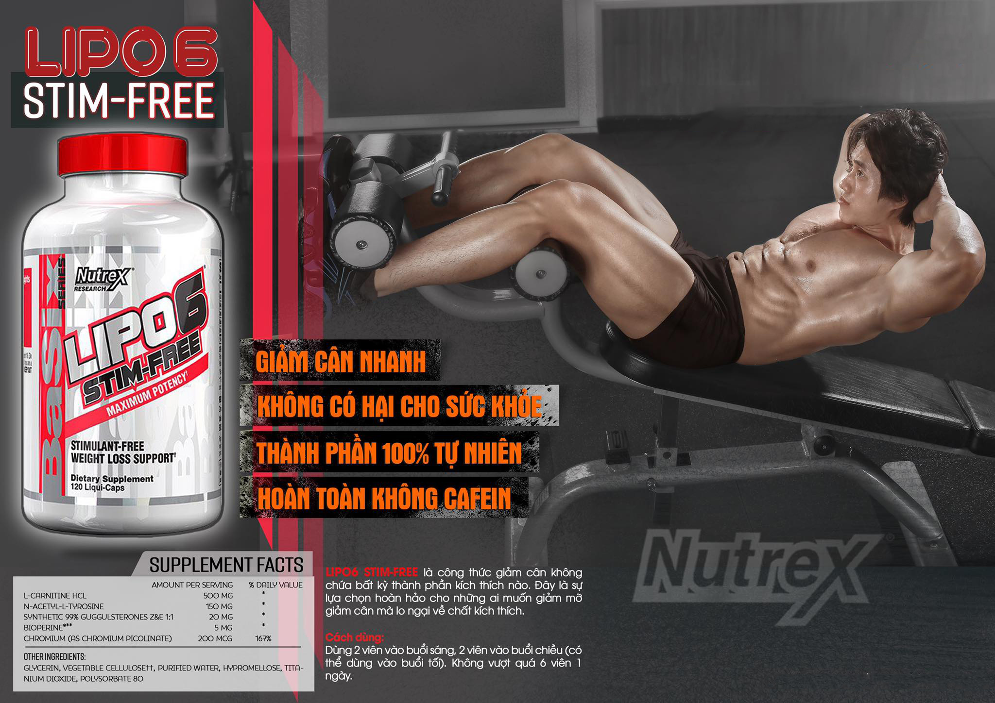 Thành phần LIPO6-STIM-FREE: Những thành phần của công thức giảm cân này được lựa chọn rất cẩn thận. Điểm nổi bật của sản phẩm này là hoàn toàn không chứa caffeine và hoàn toàn không gây hại cho sức khỏe. Những thành phần tự nhiên bao gồm:L-CarnitineHCL, N-Acetyl-L-Tyrosine, Synthetic 99%, Guggulsterones Z&E 1:1, BioperineChromium (khống chế ăn uống, giảm cảm giác đói, giảm lipit đồng thời với sự tăng trưởng cơ bắp, giúp giảm béo săn da)