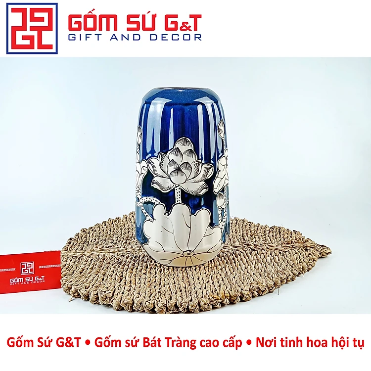 Lọ hoa men hỏa biến lá dứa miệng thấp vẽ sen Gốm Sứ G&T