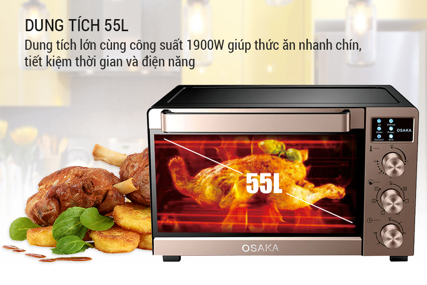 Với dung tích lò lên tới 55L giúp người dùng có thể nướng một lượng lớn thực phẩm một lúc tiết kiệm thời gian cũng như công sức tối đa. Công suất nướng cao nhất đạt 1900W giúp thực phẩm chín rất nhanh giúp bữa ăn gia đình bạn luôn sẵn sàng trong thời gian ngắn nhất.