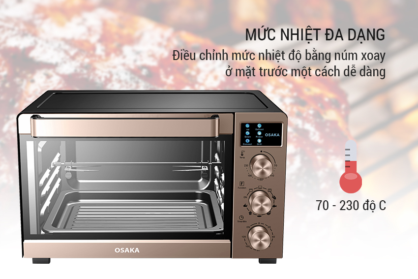 Mức nhiệt độ có thể điều chỉnh được từ 70 - 230 độ C cho phép bạn lựa chọn mức nhiệt độ phù hợp nhất với từng loại thực phẩm cúng như yêu cầu của từng món ăn khác nhau. Bạn có thể điều chỉnh mức nhiệt độ bằng núm xoay ở mặt trước một cách dễ dàng.