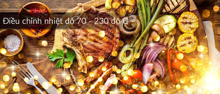 Mức nhiệt độ có thể điều chỉnh được từ 70 - 230 độ C cho phép bạn lựa chọn mức nhiệt độ phù hợp nhất với từng loại thực phẩm cúng như yêu cầu của từng món ăn khác nhau. Bạn có thể điều chỉnh mức nhiệt độ bằng núm xoay ở mặt trước một cách dễ dàng.