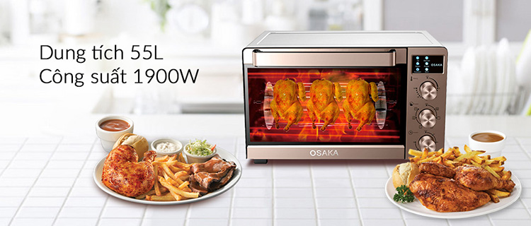 Dung tích lò lên tới 55L giúp người dùng có thể nướng một lượng lớn thực phẩm một lúc tiết kiệm thời gian cũng như công sức tối đa. Công suất nướng cao nhất đạt 1900W giúp thực phẩm chín rất nhanh giúp bữa ăn gia đình bạn luôn sẵn sàng trong thời gian ngắn nhất.