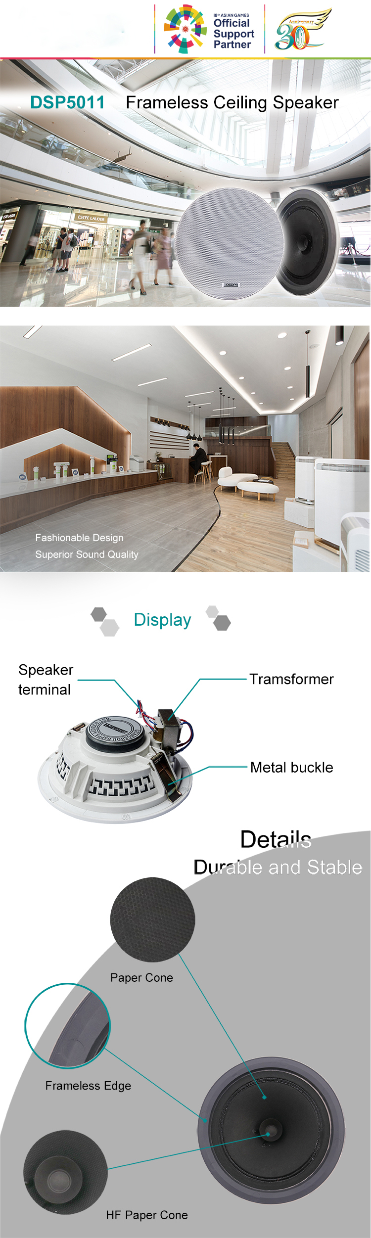 Loa âm trần DSP5011 được thiết kế đẹp mắt với kiểu dáng cực tinh gọn và hiện đại, màng loa làm bằng hợp kim nhôm chống gỉ sét, nhờ đó, chất âm khi phát ra cũng trở nên trung thực và sống động hơn bao giờ hết.