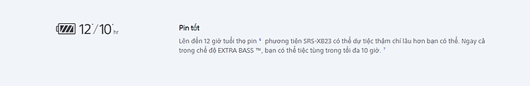 Loa di động Sony SRS-XB23 Mang tới Thời lượng pin lên tới 12 giờ (EXTRA BASS : Tối đa 10 giờ)-thay đổi theo công suất sử dụng