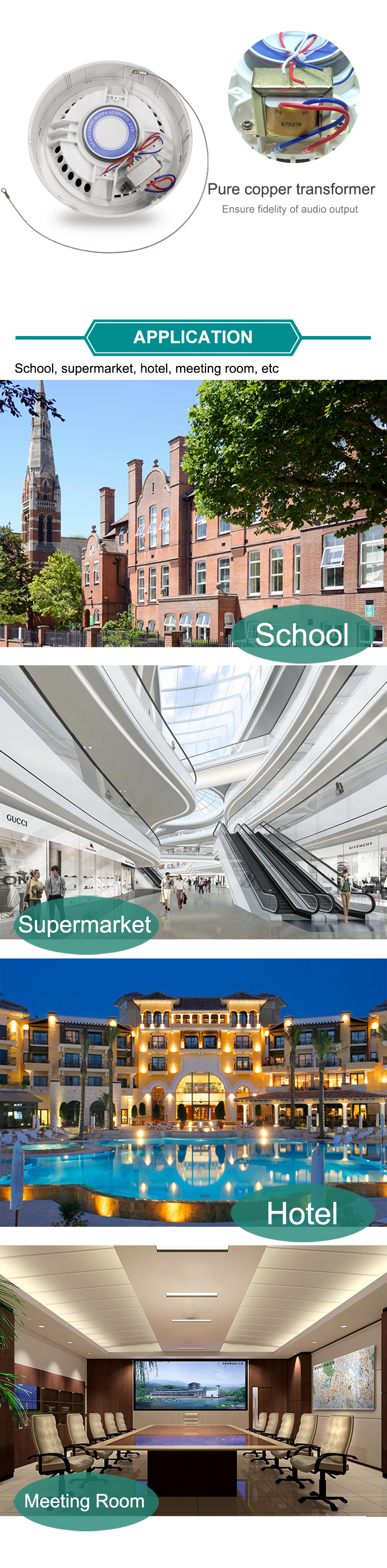Trình điều khiển loa tích hợp 6.5 ”được thiết kế đáp ứng tần số rộng 110-18,000Hz, nhiều thiết bị đầu cuối 2.5W, 5W & 10W có thể được áp dụng cho các dịp khác nhau về kích cỡ khu vực và tiếng ồn nền
