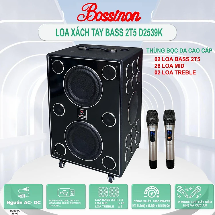 Loa Karaoke xách tay Bossinon D2539K - 26 Đường tiếng, Công Suất 1000W, 2 Bass 25Cm, 2 Treble - HÀNG CHÍNH HÃNG